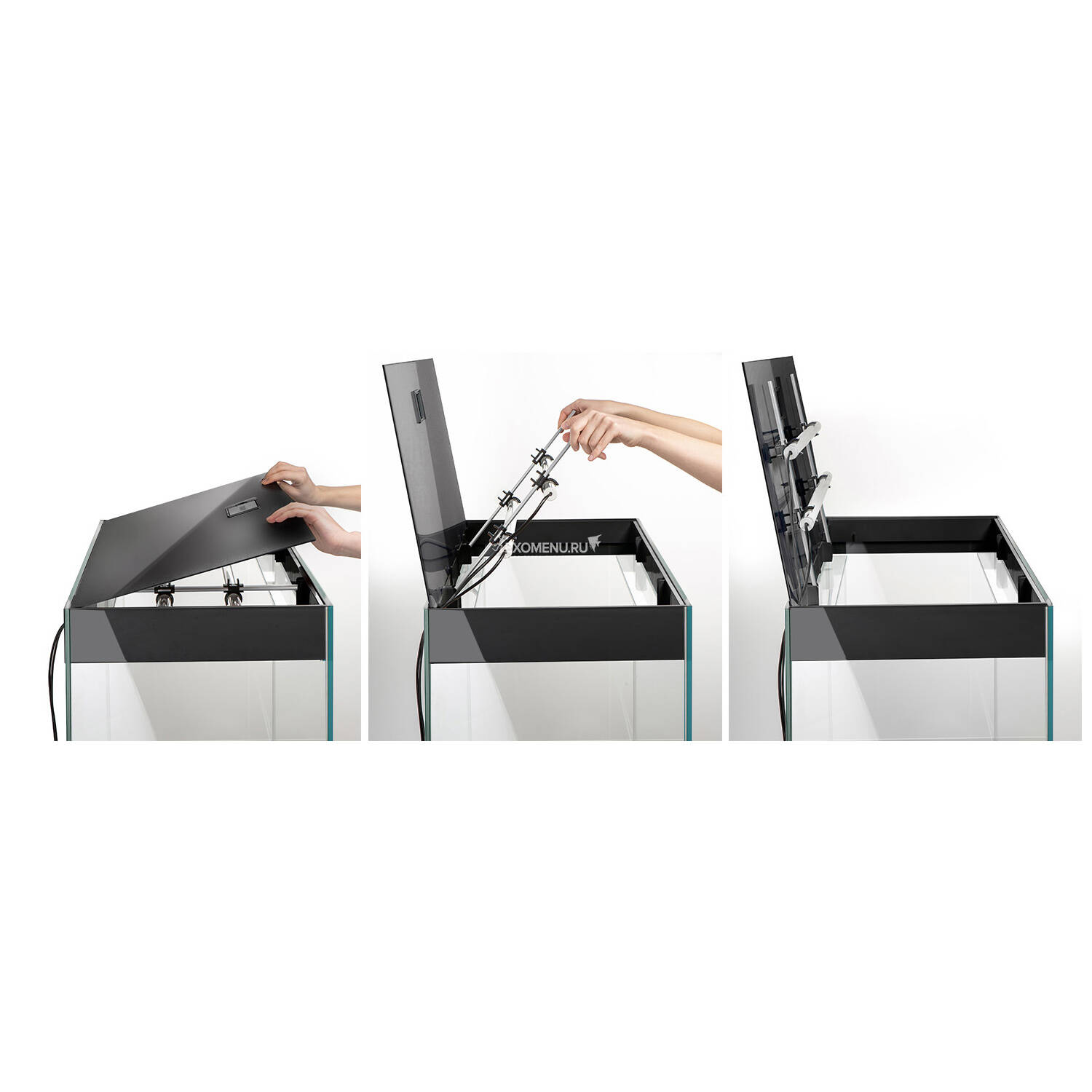 Для получения доступа к внутренней части аквариума, крышку и рельсы поднимают и ставят вертикально на заднюю стенку. Это решение освобождает аквариумиста от необходимости удерживать конструкцию или искать место, куда её отложить. Модули можно направить в аквариум, поэтому все сервисные работы выполнятся при хорошем освещении.