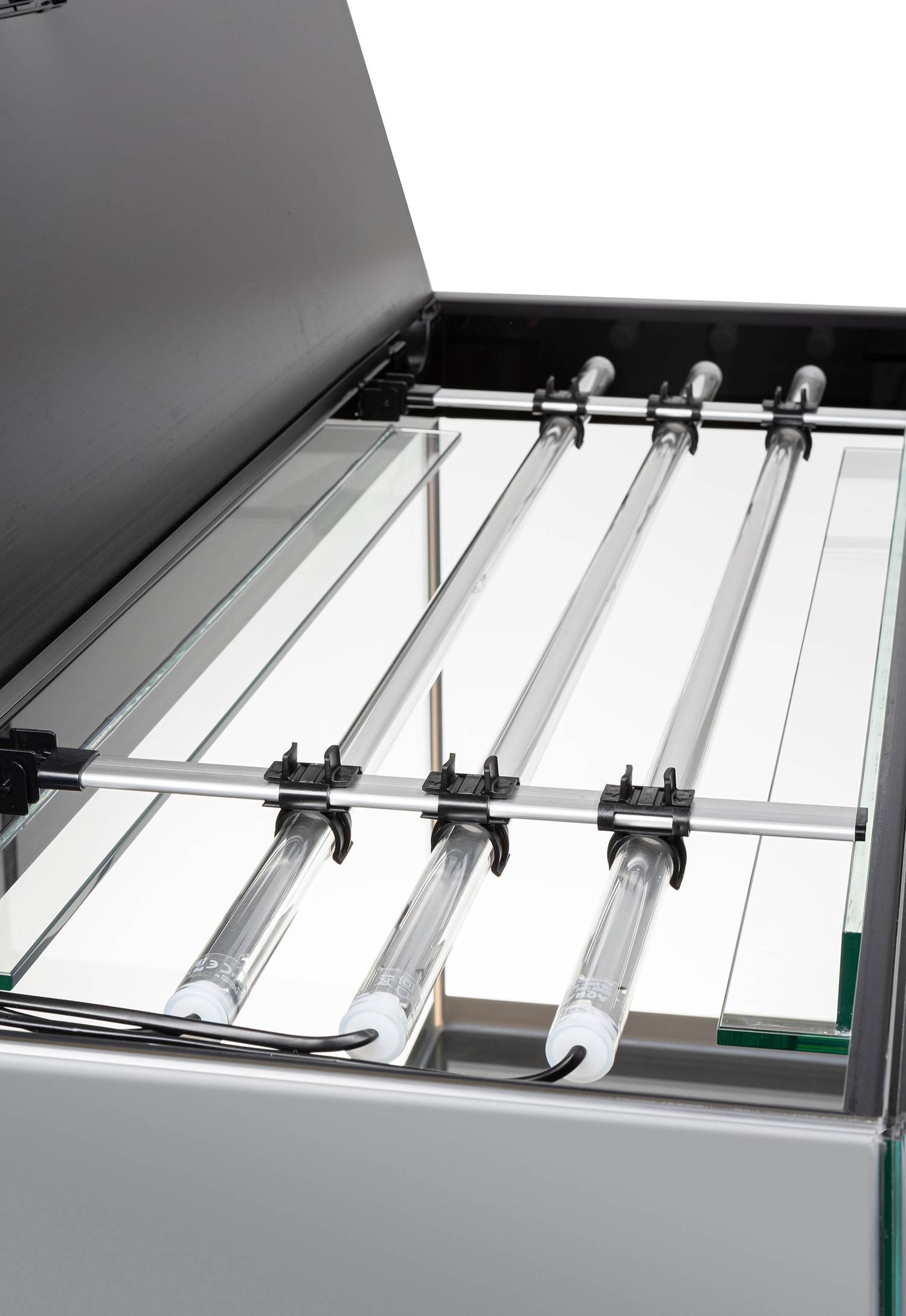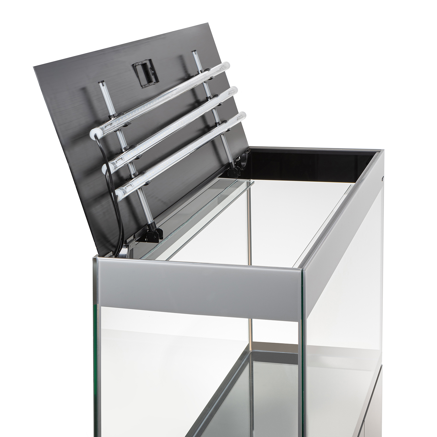Для получения доступа к внутренней части аквариума, крышку и рельсы поднимают и ставят вертикально на заднюю стенку. Это решение освобождает аквариумиста от необходимости удерживать конструкцию или искать место, куда её отложить. Модули можно направить в аквариум, поэтому все сервисные работы выполнятся при хорошем освещении.