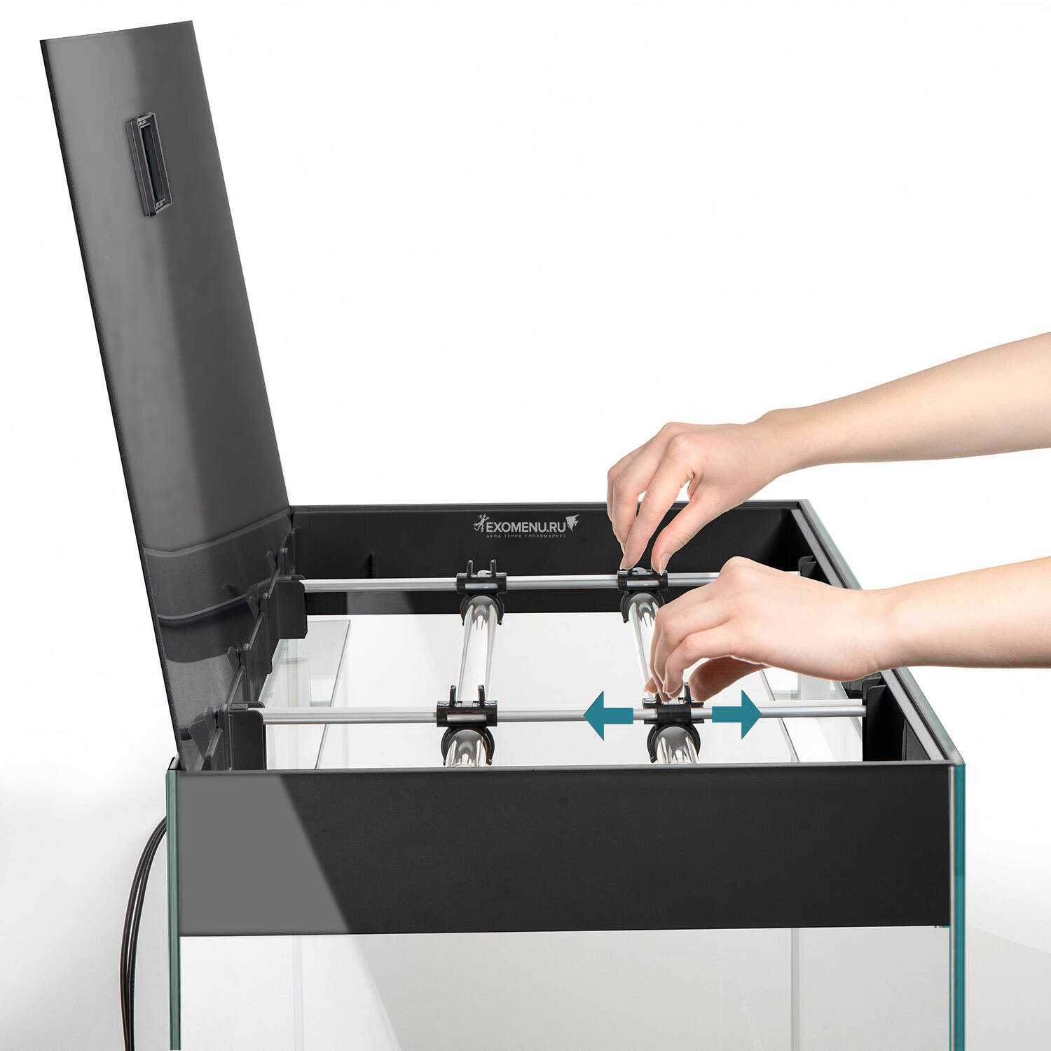Для получения доступа к внутренней части аквариума, крышку и рельсы поднимают и ставят вертикально на заднюю стенку. Это решение освобождает аквариумиста от необходимости удерживать конструкцию или искать место, куда её отложить. Модули можно направить в аквариум, поэтому все сервисные работы выполнятся при хорошем освещении.