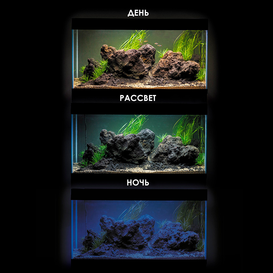 В комплект входят два осветительных модуля с функцией переключения освещения «день/рассвет/ночь». При выборе ночного режима включится мягкий синий свет, аквариум может играть роль ночника в детской, а также позволит наблюдать за гидробионтами, прячущимися при дневном освещении.