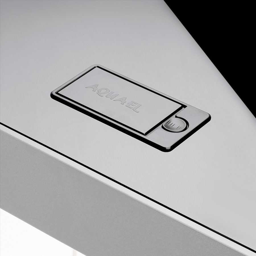 Нижняя рамка прекрасно сочетается с элегантной крышкой, оснащенной запатентованной системой Smart Open (Смарт Оупен). Система позволяет легко открывать и удерживать крышку в нужном положении. Для кормления обитателей предусмотрен открывающийся лючок. На задней стенке аквариума предусмотрены технические отверстия для размещения шлангов внешних фильтров. Через них также удобно выводить провода.