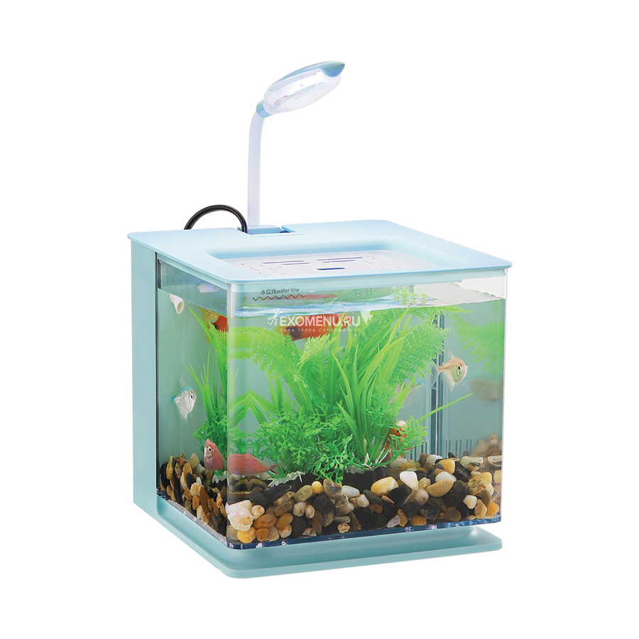 Аквариум объемом 4,5 литра оснащен встроенной системой фильтрации, состоящей из помпы и комплекта фильтрующих материалов, и светодиодного светильника с функцией переключения режимов и интенсивности освещения. Подключение – отдельные разъемы USB для системы фильтрации и светильника.