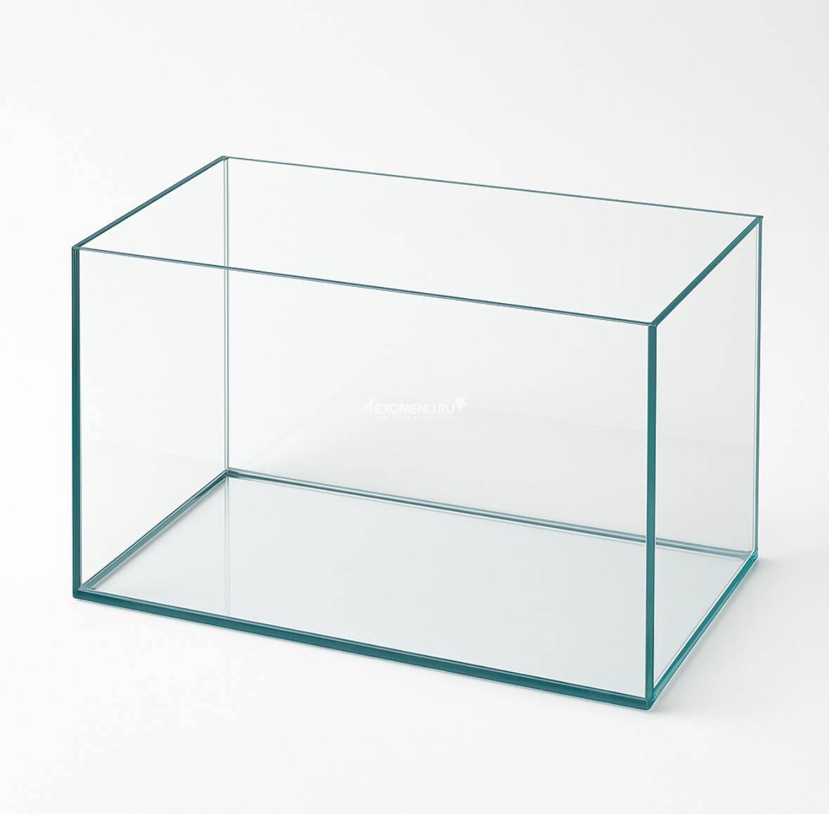 Аквариум прямоугольной формы из стандартного стекла. Имеет панорамное переднее стекло — передние вертикальные швы отсутствуют. Аквариум укомплектован покровным стеклом с прозрачными держателями.