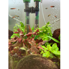 В домашнем аквариуме альтернантера образует огненного цвета кустики высотой до полуметра и 10-15 см в окружности. Её длинные прямостоячие стебли растут и на воздухе, сгибаясь под своей тяжестью и свободно плавая по поверхности воды. Но при значительном развитии вегетативной части над водой у растения начинают опадать подводные листья. Для предотвращения нежелательного явления аквариумисты советуют прищипывать верхнюю точку роста – это даёт толчок к активному разветвлению растения и образованию пушистого куста.