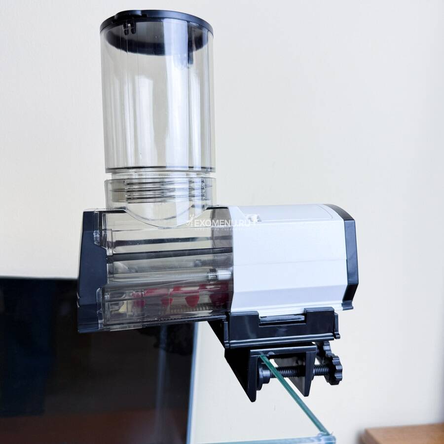 - Установите кормушку на край аквариума с помощью крепления.
