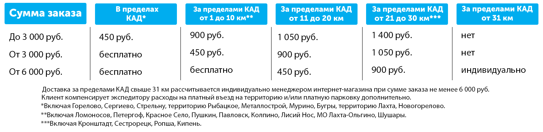 Курьерская доставка осуществляется только из магазина по адресу: г. Санкт-Петербург, ул. Промышленная, дом 5. Вам необходимо оформить заказ в нашем интернет-магазине или забронировать товары по телефону. Минимальная сумма товара для доставки должна составлять 1000 рублей. Заказ подтверждаем в течение часа, созваниваясь с Вами. Интервалы доставки по выбору.