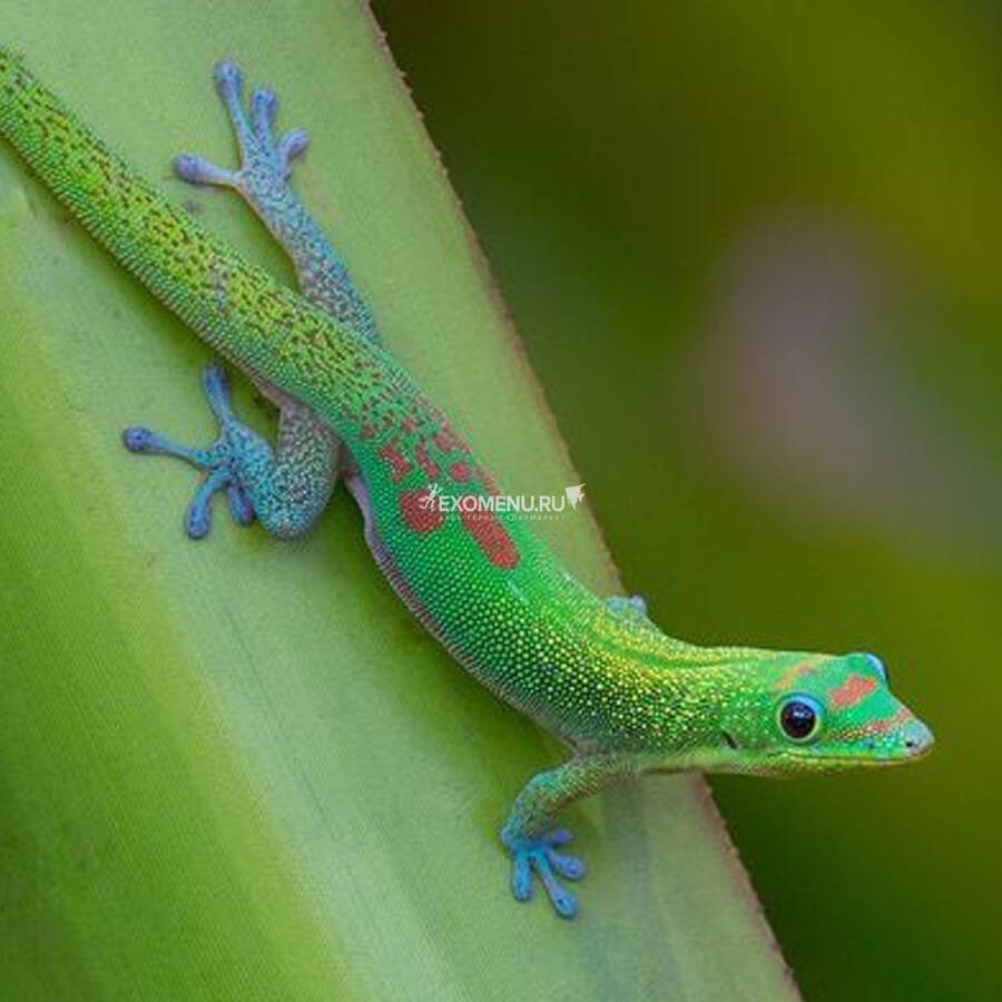 Это очень красочный вид - окрас изменяется в зависимости от температуры и освещения: от ярко-зеленого до желтовато-зеленого. На шее рассыпаны желтые пятна в виде веснушек. На голове присутствуют две красные полосы, на спине расположено три больших красных пятна, которые доходят до хвоста. Верхнее веко синеватое.