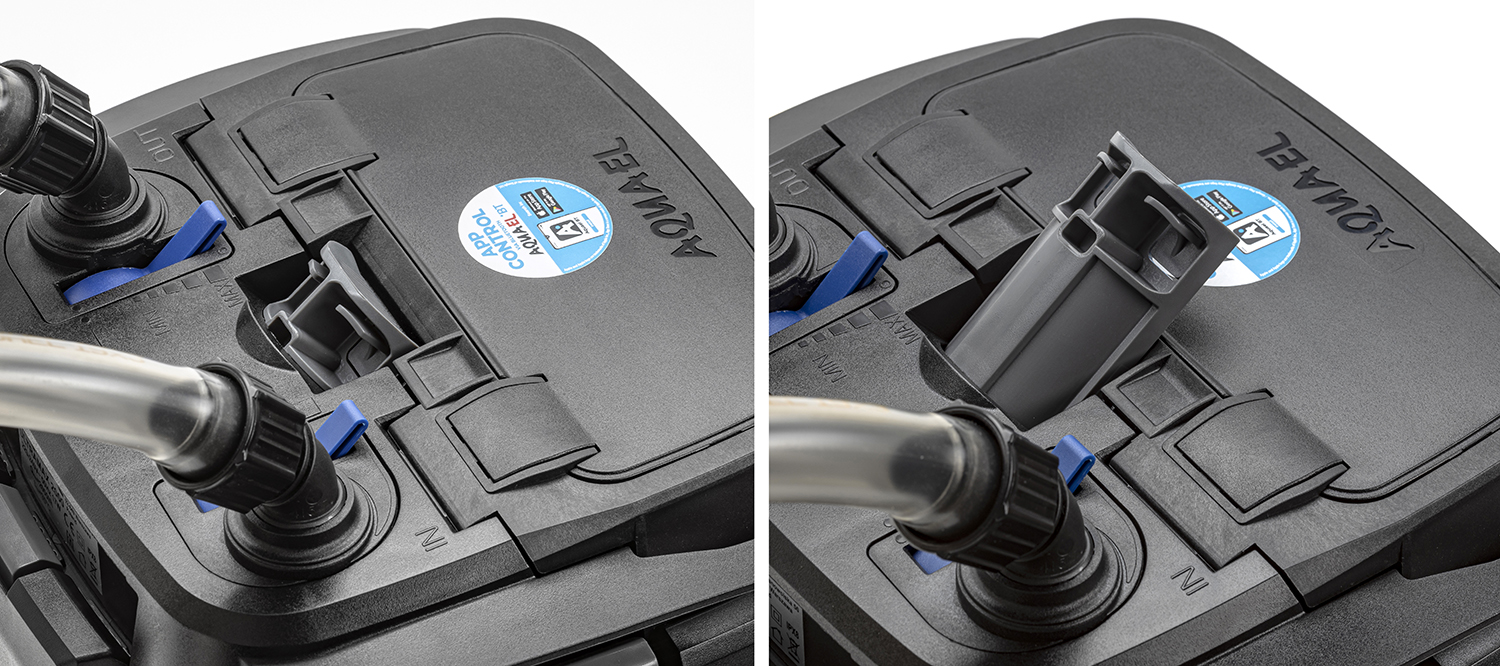 Чтобы избежать вытекания воды, используется запатентованная система двойного запорного клапана. Он одновременно закрывает входное и выходное отверстия фильтра в крышке, а также просвет шлангов. Таким образом блокируется выход воды.