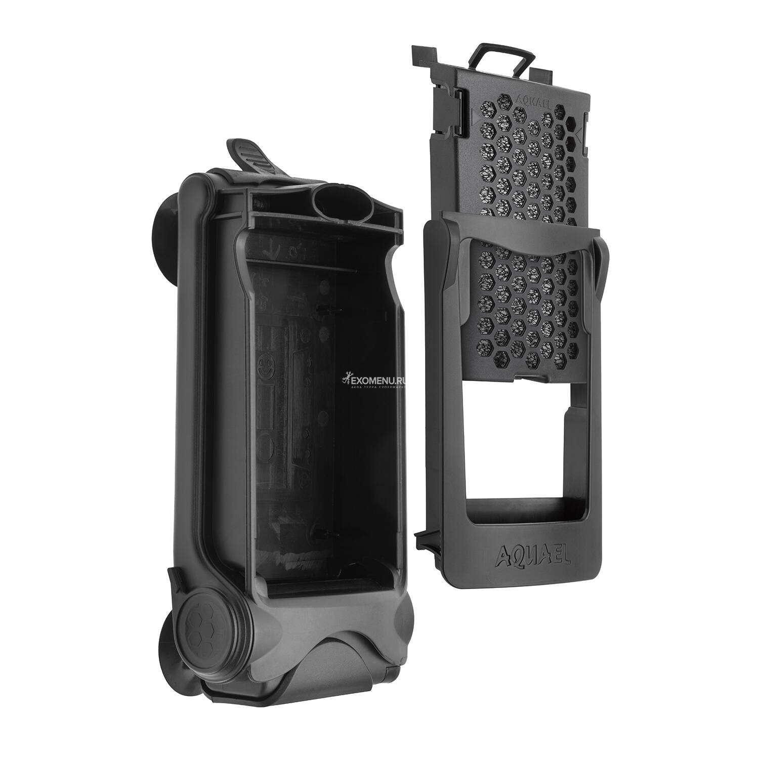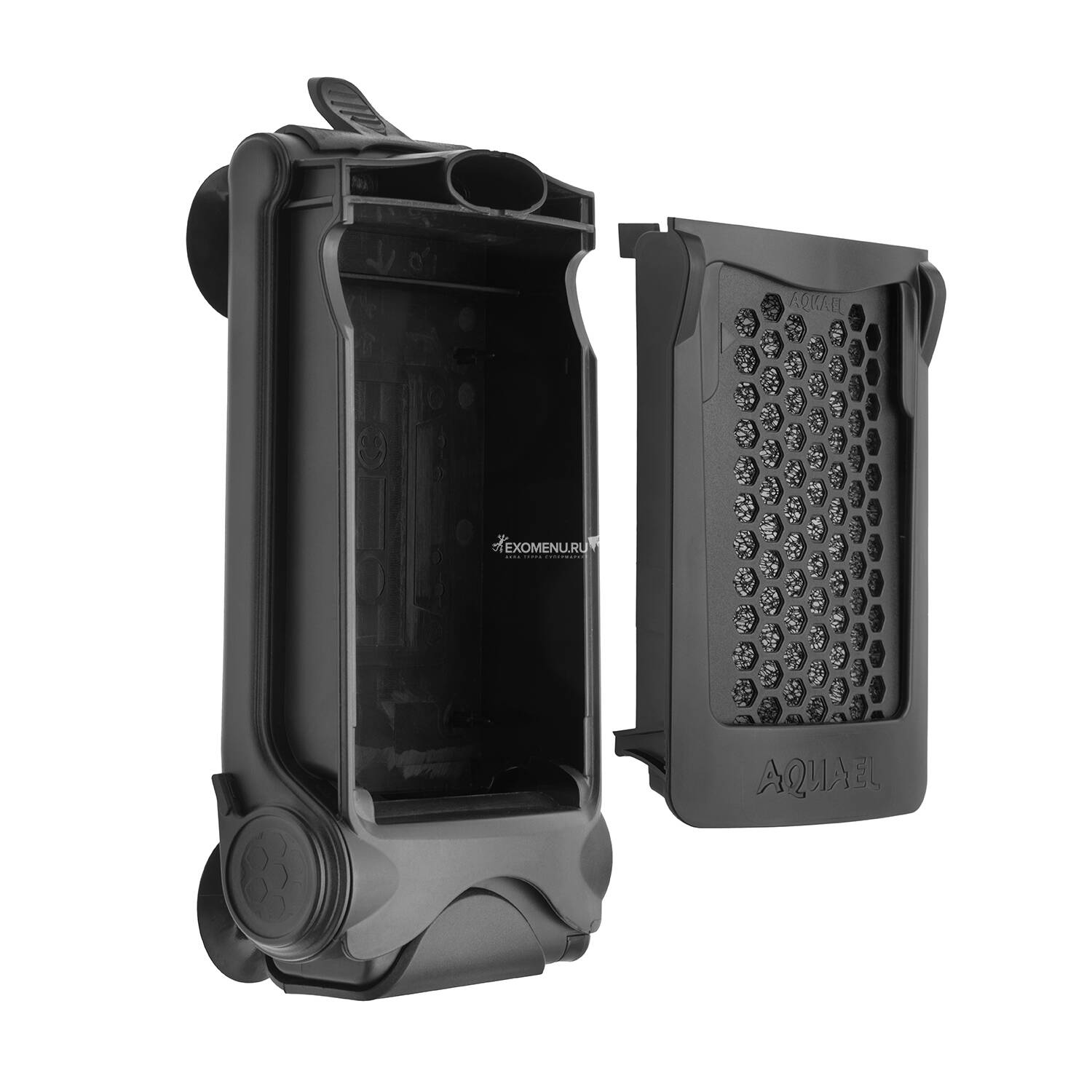 Фильтр крепится на 4 присоски. Картридж с фильтрующим модулем плавно выдвигается при нажатии. Это значительно облегчает обслуживание фильтра — двигатель все время остается в воде, а фильтрующий элемент можно снять, очистить или заменить.