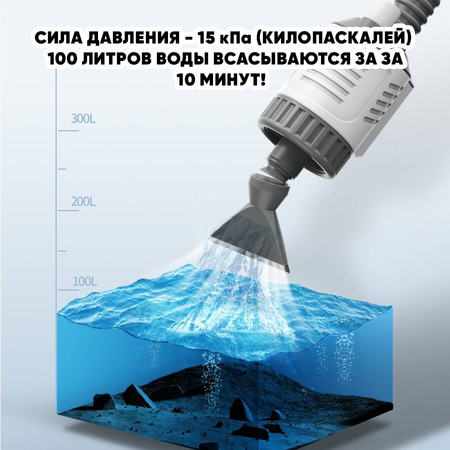 Сильная сила всасывания быстро захватывает отходы и твёрдые частицы, очищая грунт глубже, чем обычные сифоны.