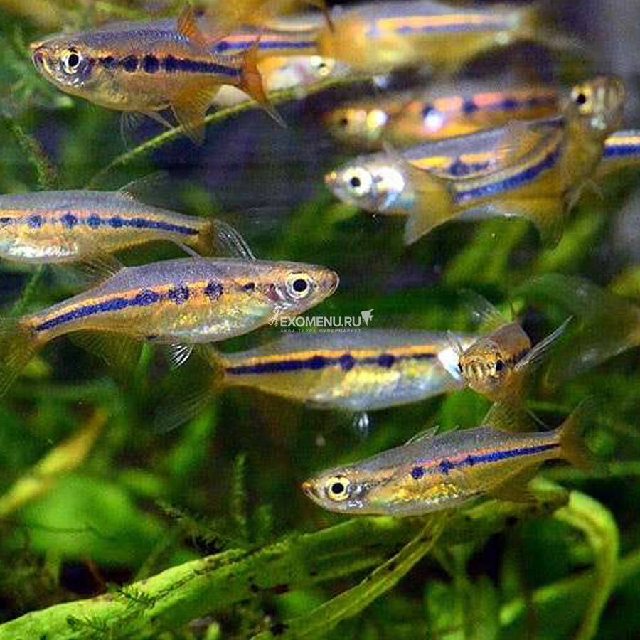 Окрас рыбки: оливковая спинка плавно переходит в золотисто-зеленоватые бока с серебристым блеском. Вдоль всего тела тянется контрастная темно-голубая нить, над которой сияет золотистая кайма. Иногда на теле проступают 2–5 темных пятнышек. Самцы выглядят эффектнее: они стройнее самок.