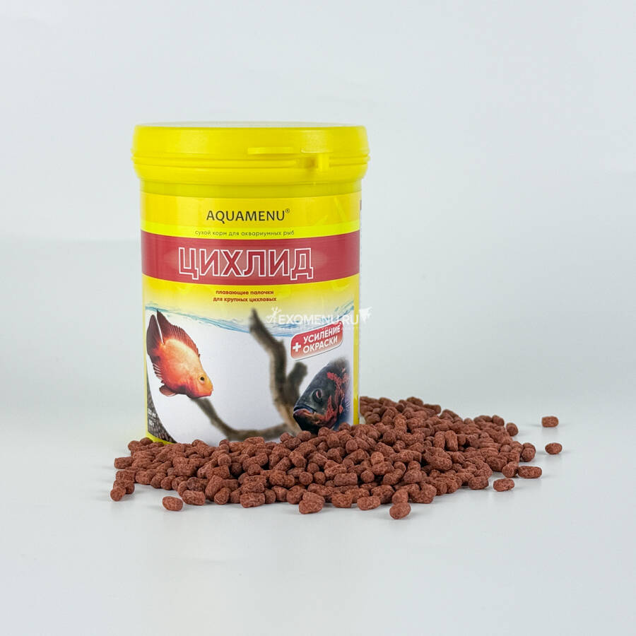 AQUAMENU® ЦИХЛИД - ежедневный корм для крупных цихловых с эффектом усиления окраски. Красные, оранжевые, желтые тона окраски рыб становятся ярче в течение нескольких недель регулярного кормления.