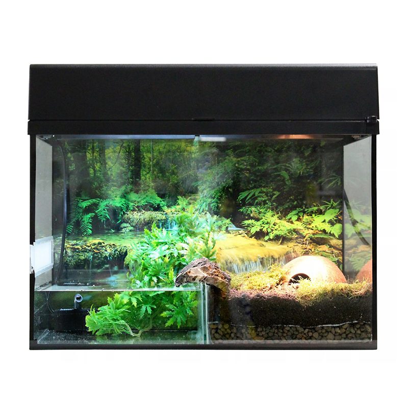 Основание террариума позволяет воссоздать водоем, в котором амфибии могут проводить время, а в другой части террариума воссоздается суша. Террариум оснащен специальным освещением : ультрафиолетовая лампа Т5, благодаря которой амфибии, как в природе, получают ультрафиолет, который необходим для усвоения кальция, а также в террариум установлена галогеновая лампа, которая создает теплый угол, в котором любят греться амфибии. В наполнение террариума входит натуральный субстрат (земля, мох и керамзит, который прекрасно подходит для содержания амфибий. Также в набор входит миска, из которой Ваш питомец может пить воду или питаться ,а также натуральные (кора) и искусственные (растение) элементы декорации, которые индивидуальны для каждого набора.