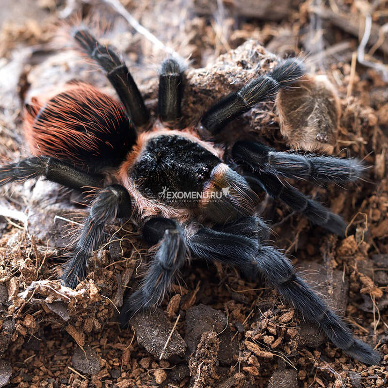 В окраске паука преобладает черный цвет, а брюшко обильно покрыто волосками оранжевого или красного цвета.