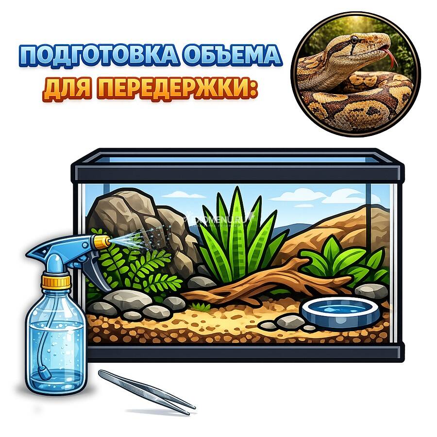 При подготовке учитываются особенности содержания крупных видов змей: подбирается подходящий тип субстрата, обеспечивается необходимый уровень влажности, организуется укрытие и вентиляция, а также исключаются элементы, способные травмировать животное.