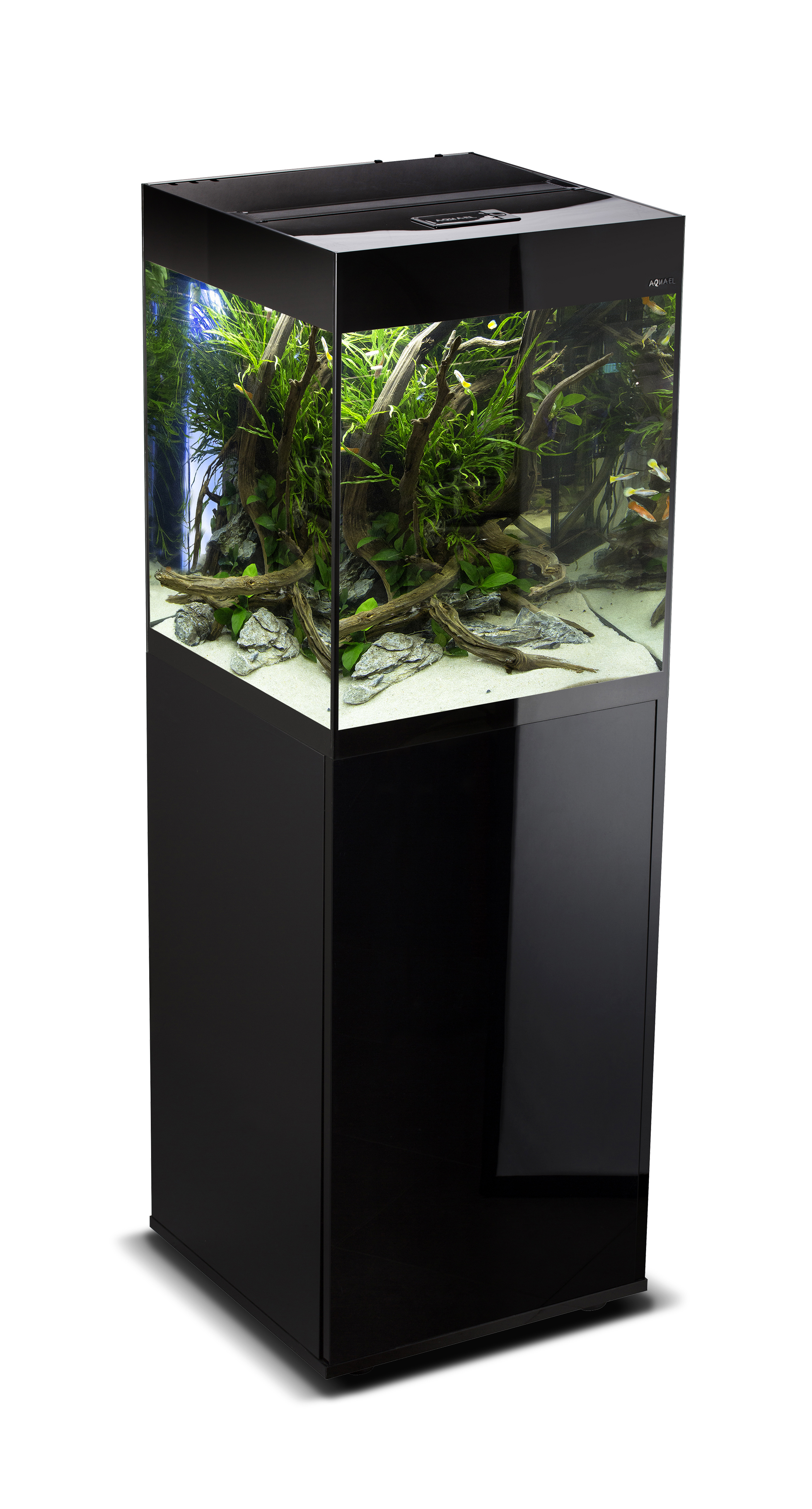 Для аквариума AQUAEL GLOSSY CUBE (Акваэль Глосси Кьюб) предусмотрена специальная тумба: она имеет квадратную столешницу 50х50 см и высоту 90 см. Ширина тумбы указана с учётом ширины дверцы.