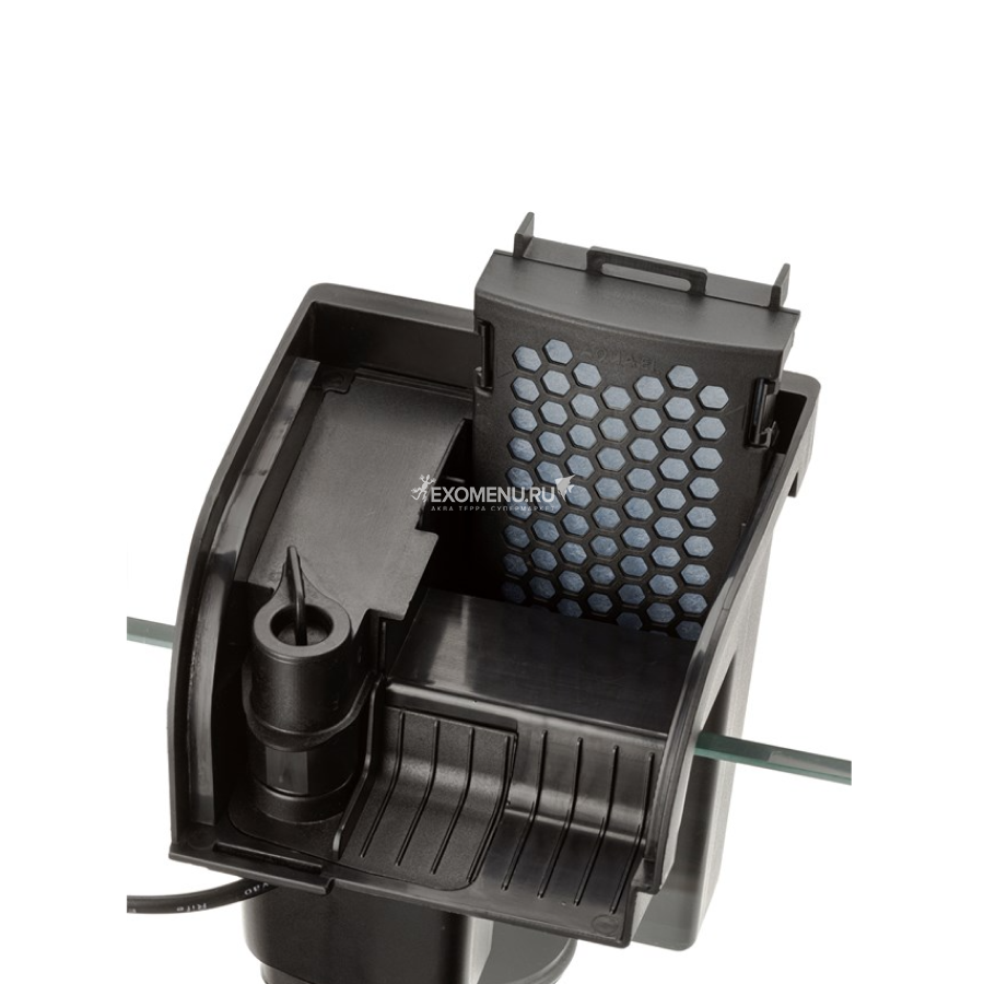 Очищенная вода поступает в аквариум, переливаясь через край корпуса, и создаёт эффект "водопада", который вызывает легкое движение поверхности воды, тем самым обеспечивая аэрацию и повышая уровень содержания в ней кислорода.