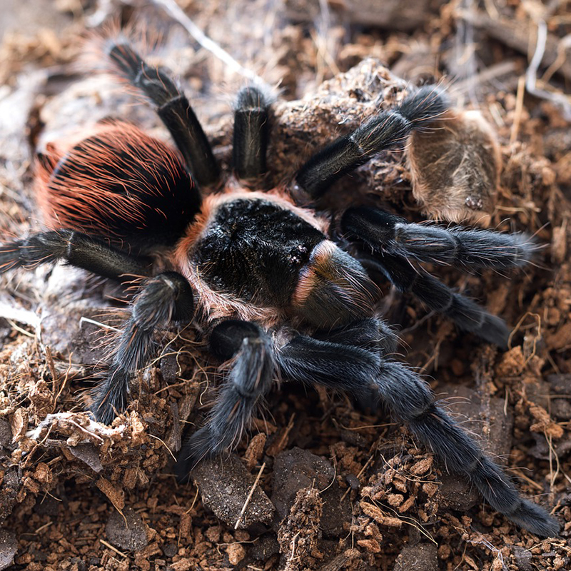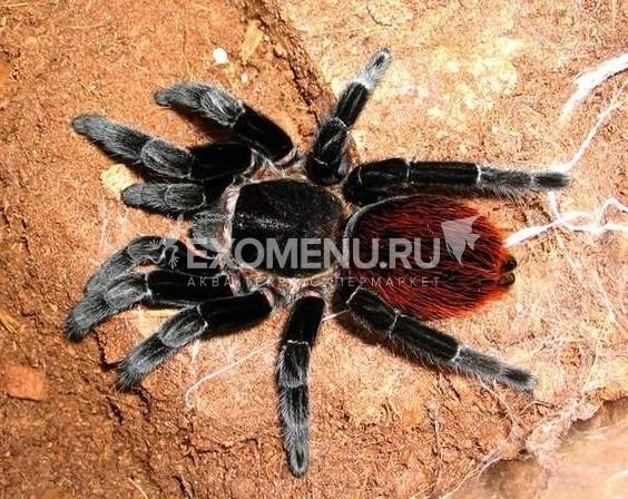 В окраске паука преобладает черный цвет, а брюшко обильно покрыто волосками оранжевого или красного цвета.