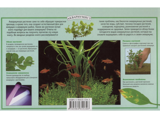 От издателя: Аквариумные растения сами по себе образуют прекрасное зрелище, а кроме того, они создают естественный фон для живущих в аквариуме рыбок. Какие же растения лучше всего подойдут для вашего аквариума? Ответы на подобные вопросы вы получите, прочитав эту новую книгу. Во вводных разделах книги рассматриваются такие проблемы, как биология аквариумных растений, качество воды, субстрат, техника посадки растений, освещение, подкормка, размножение растений и поддержание их здоровья. Затем приводится обзор более пятидесяти видов аквариумных растений, которые вы сможете выращивать себе на радость в своем аквариуме.