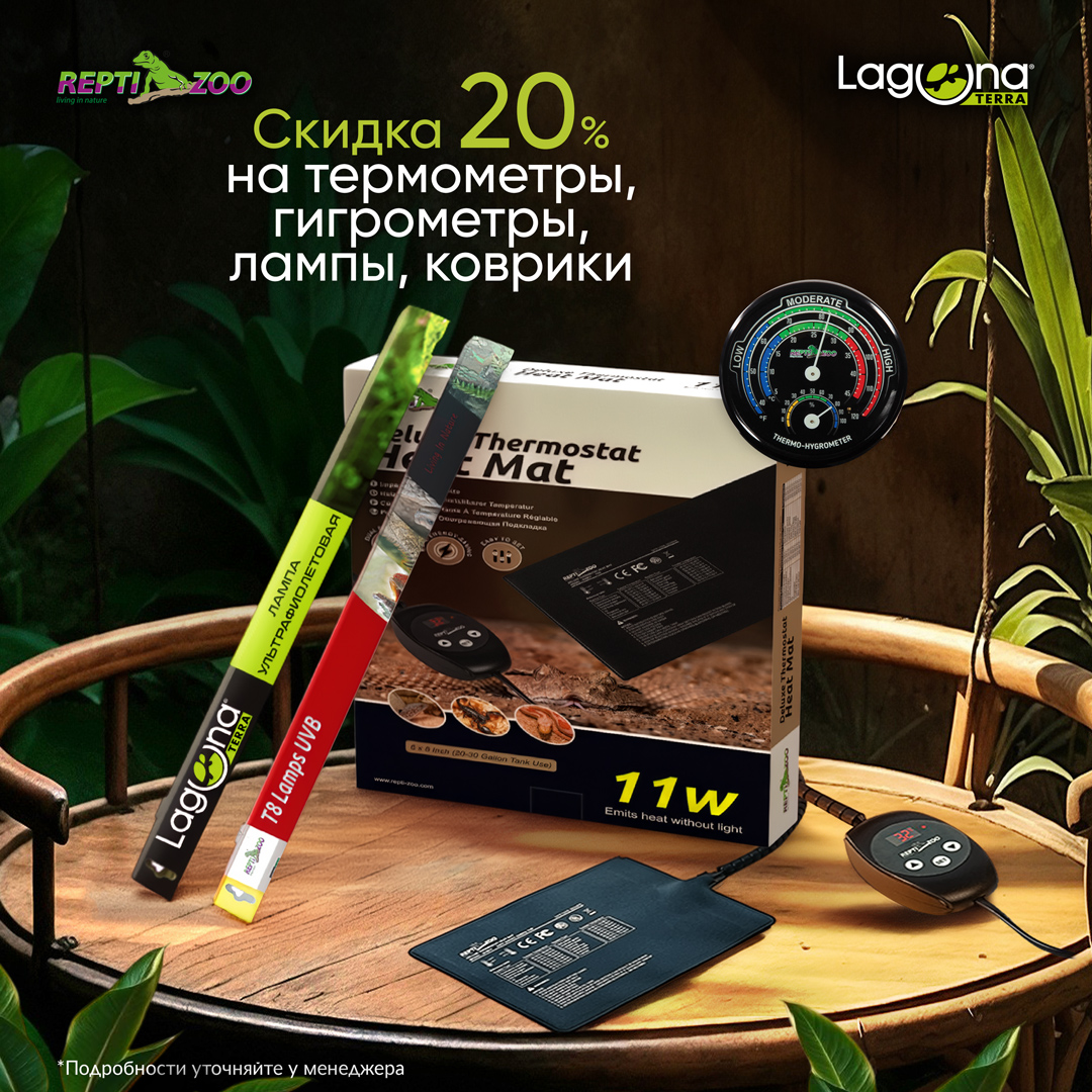 С 13.03.2026 по 30.04.2026 включительно действует скидка 20% на *избранные товары для террариумистики от брендов LAGUNA TERRA и REPTI ZOO.
