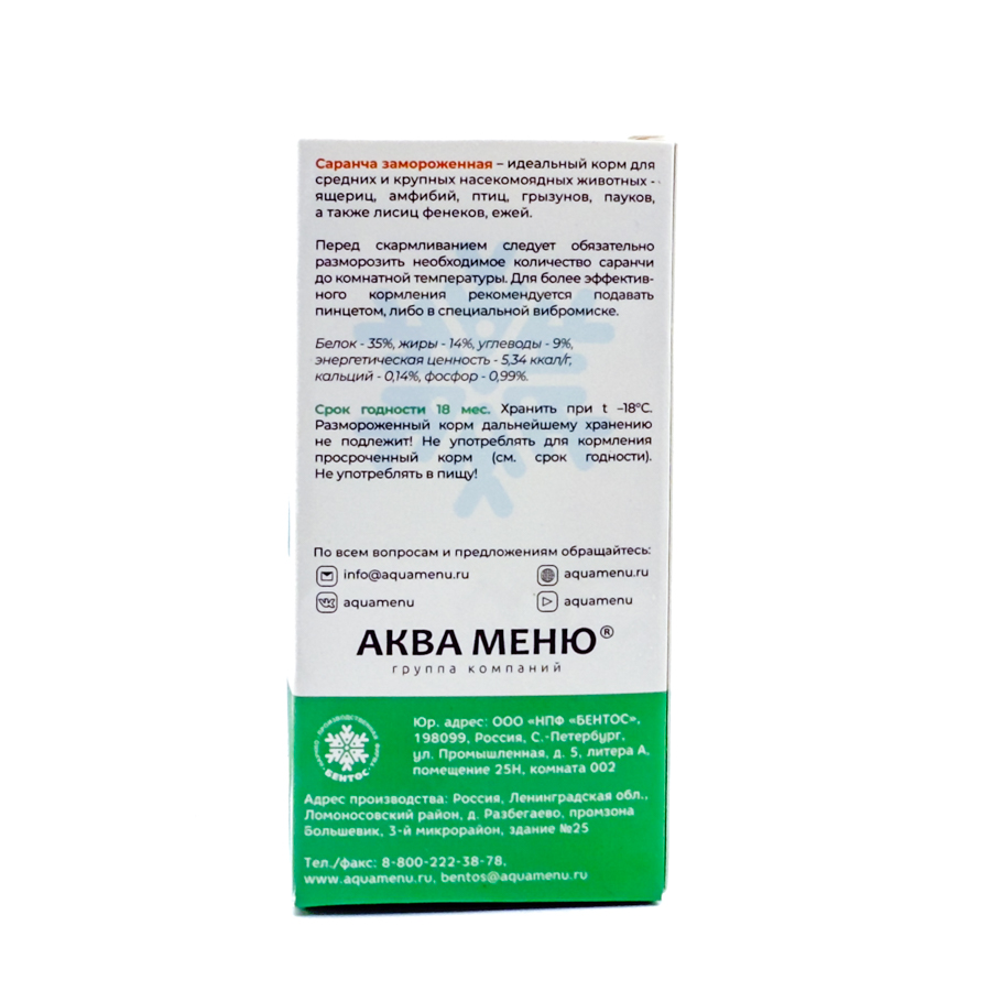 Саранча замороженная - идеальный корм для средних и крупных насекомоядных животных - ящериц, амфибий, птиц, грызунов, пауков, а также лисиц фенеков, ежей. Для более эффективного кормления саранчу рекомендуется подавать пинцетом, либо в специальной вибромиске. Хранить в бытовых морозильных камерах при t - 18.