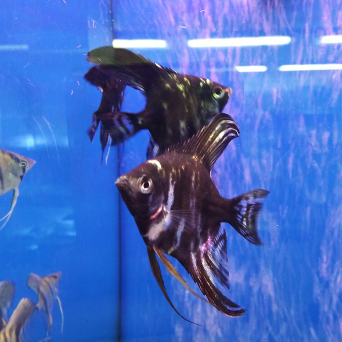 Скалярии (Pterophyllum scalare) являются одними из самых красивых аквариумных рыбок. Эти южно-американские цихлиды просто завораживают своей элегантностью и красотой. В природе скалярии обитают в северной части Южной Америки в водоемах с густой тростниковой зарослью и со стоячей, либо медленно текущей водой. Этими природными условиями объясняется их уплощенная – дискообразная форма тела, которая необходима им для маневрирования среди подводного тростника. Держатся в природе группами от 10-ти особей. Тело скалярии круглое и очень сплющенное по бокам. Имеет сильно удлиненный спиной и анальный плавник, что придает рыбке очертания полумесяца. Естественная природная окраска скалярий серебристая с черными поперечными полосками, однако в результате успешной селекции были получены разнообразные цветовые гаммы, например, мраморная скалярия, двухцветная, красная, черная, скалярия зебра и другие. Кроме того, выведена вуалевая форма скалярий – с еще более длинными плавниками. Скалярии – крупные рыбы, в длину могут достичь до 15 см, а в высоту до 25 см.
