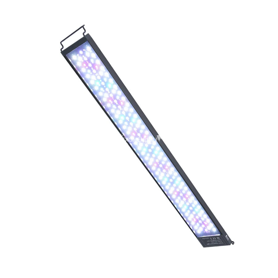 Полноспектральный светильник для пресноводных аквариумов. Можно установить таймер на восход и закат солнца, он может имитировать интенсивность света в соответствии с установленным периодом. Размер светильника (без регулировочного кронштейна) – 90 см. Подходит для аквариумов длинной 90-120 см. Мощность 56 Вт. 213 диода: 116 белых, 28 синих, 13 красных, 13 зеленых и 43 RGB. Яркость 2980 Лм, цветовая температура 6000-10000 К. Светильник имеет защиту от влаги.