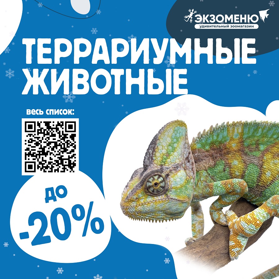 СКИДКИ ДО 20% НА ПОПУЛЯРНЫЕ ВИДЫ ТЕРРАРИУМНЫХ ЖИВОТНЫХ C 25.12.2025 ПО 31.01.2026