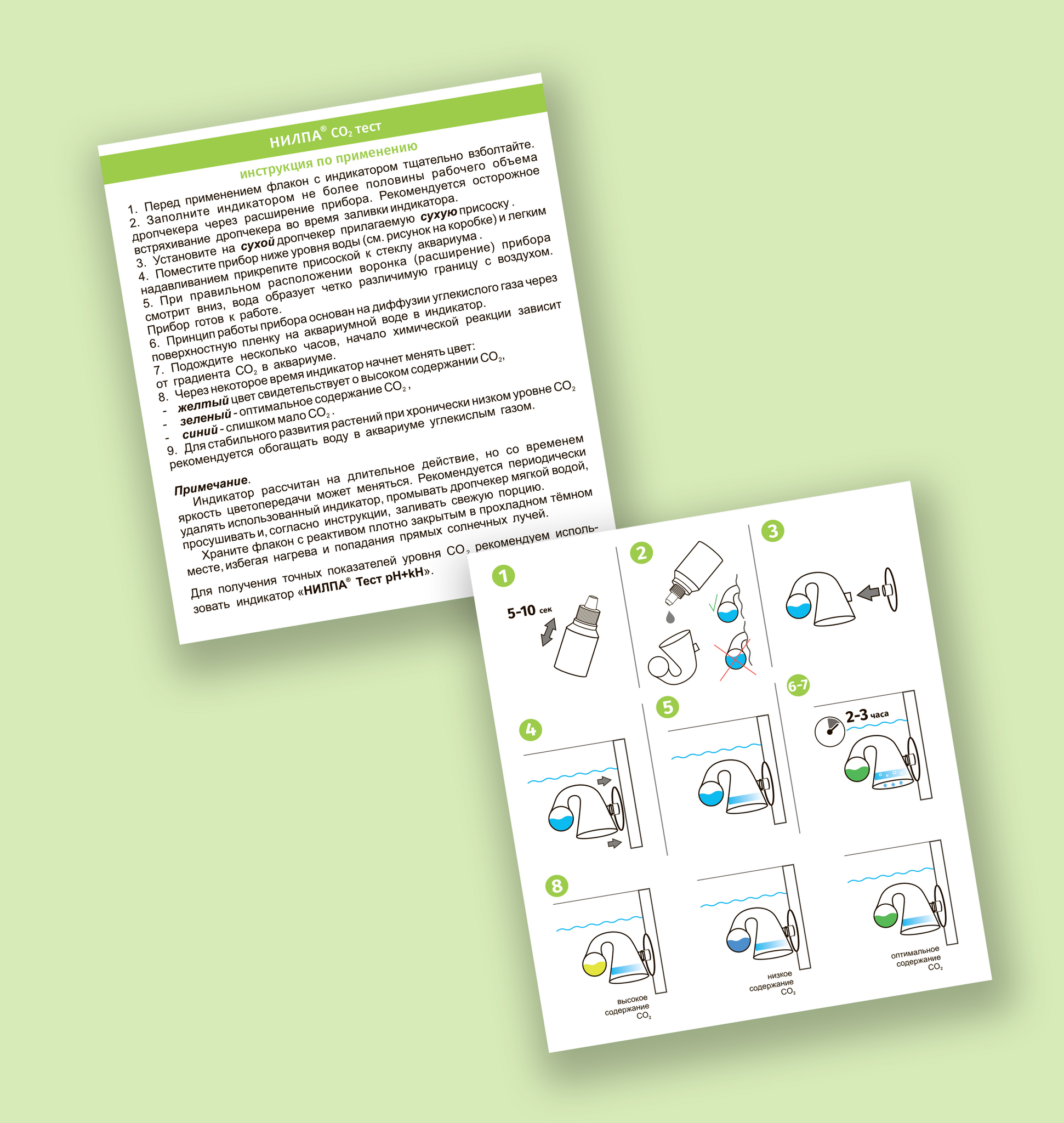 Примечание — Индикатор для измерения СО2 в воде длительного действия, но со временем яркость цветопередачи может меняться. Рекомендуется периодически удалять использованный индикатор, промывать дропчекер мягкой водой, высушивать и, согласно инструкции, заливать новую порцию индикатора. Хранить флакон с реактивом плотно закрытым в прохладном, темном месте. Избегать нагрева и прямых солнечных лучей.